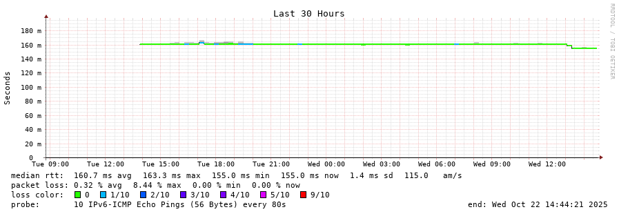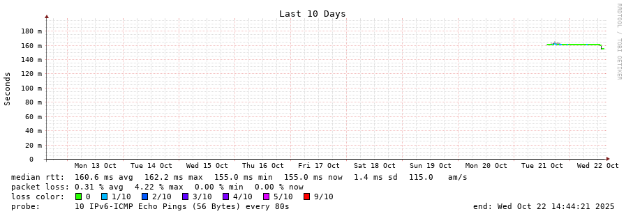 13 > 2001:ac8:10:10::d185 (2001:ac8:10:10::d185) [AS9009] 160.432ms 160.448ms 160.426ms